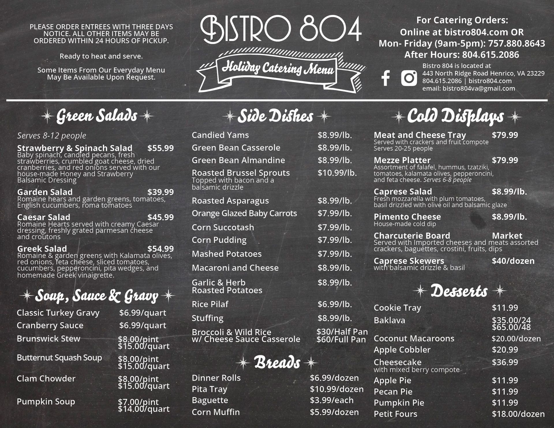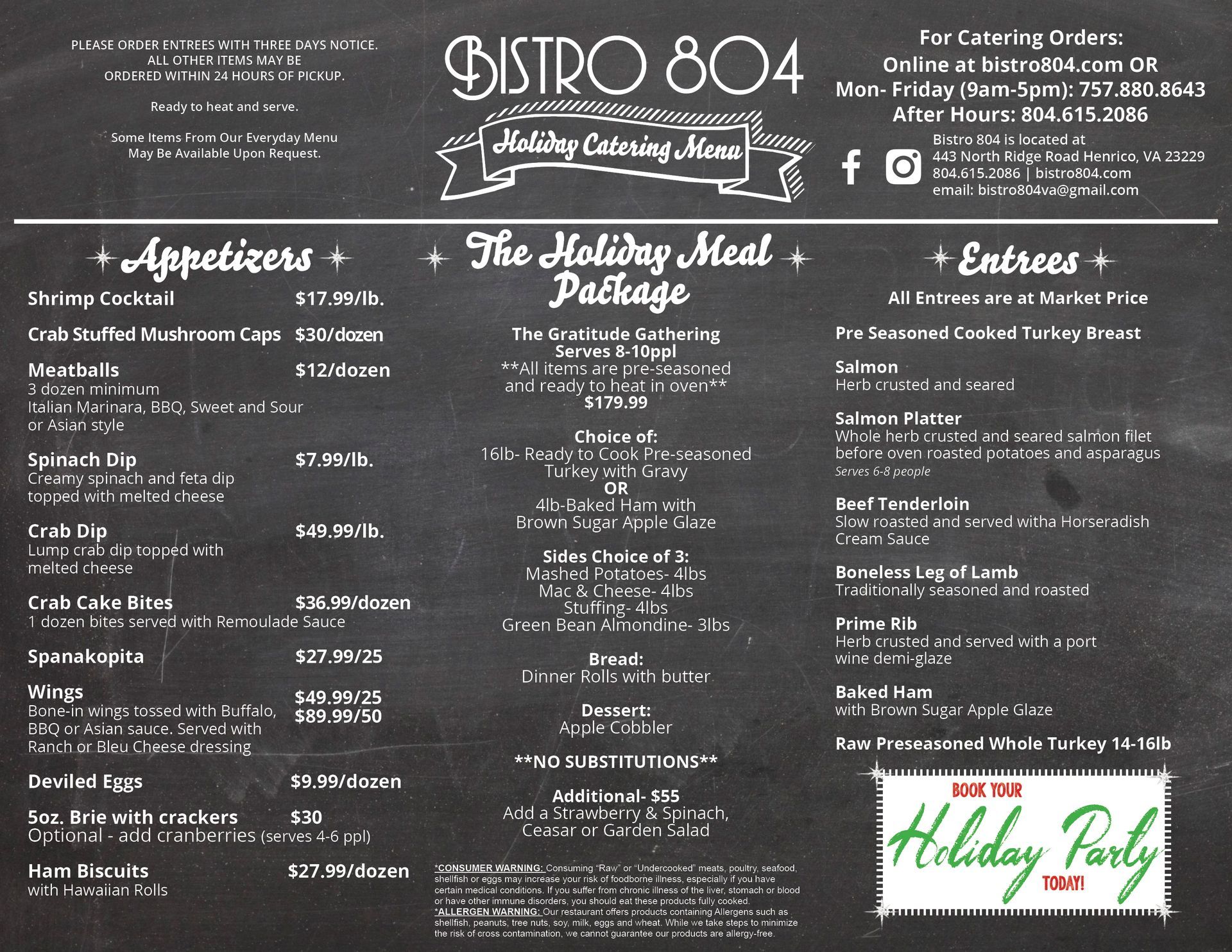 Please order entrees within three days notice.